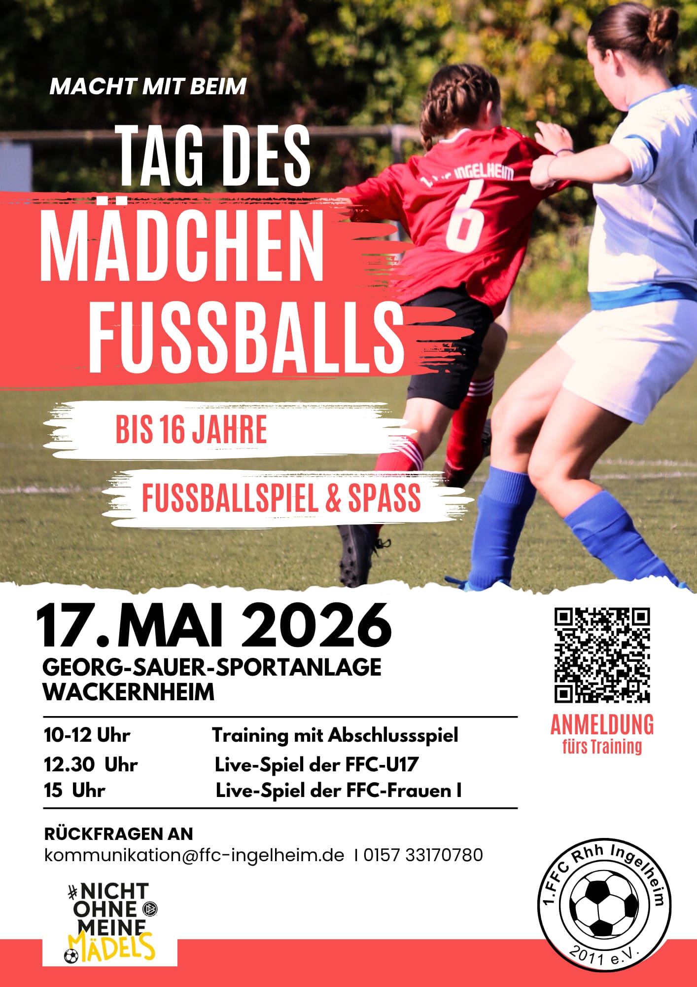 Am 17. Mai 2026 veranstalten wir den Tag des Mädchenfußballs 2026 bei uns auf der Georg-Sauer-Sportanlage in Wackernheim! Von 10 bis 12 Uhr erwartet euch ein abwechslungsreiches Fußballtraining mit anschließendem Abschlussturnier. Ganz egal, ob ihr noch ganz neu beim Fußball seid oder bereits kickt: Alle Mädchen bis 16 Jahre sind beim Training willkommen! Teilnahme am Training ist nur nach vorheriger Anmeldung möglich: https://ffc-ingelheim.de/2026/03/24/tag-des-maedchenfussballs-2026/
